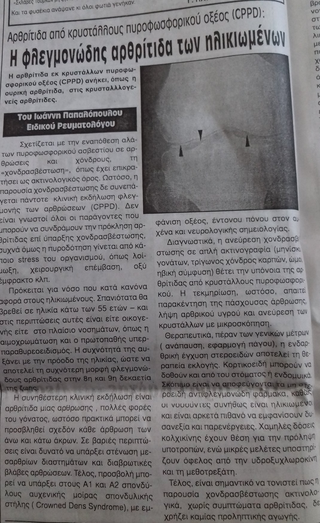 Αρθρίτιδα από κρυστάλλους πυροφωσφορικού οξέος (CPPD):Η φλεγμονώδης αρθρίτιδα των ηλικιωμένων